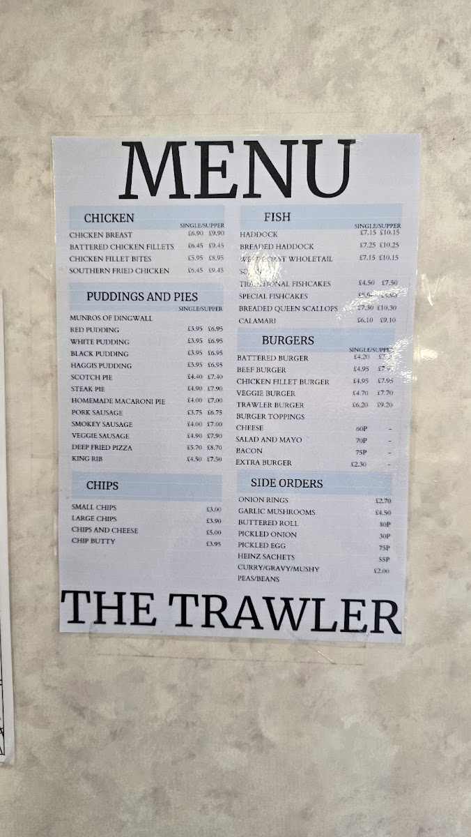 Located on Main St in Golspie, The Trawler Fish & Chips has carved out a niche for itself with its delightful offerings that capture the essence of traditional British cuisine. Their menu shines with succulent haddock options, available as standard (£10.15) or breaded (£10.25), alongside flavorful fishcakes and calamari (£9.10). For burger enthusiasts, the Trawler Burger (£6.20) is a standout.